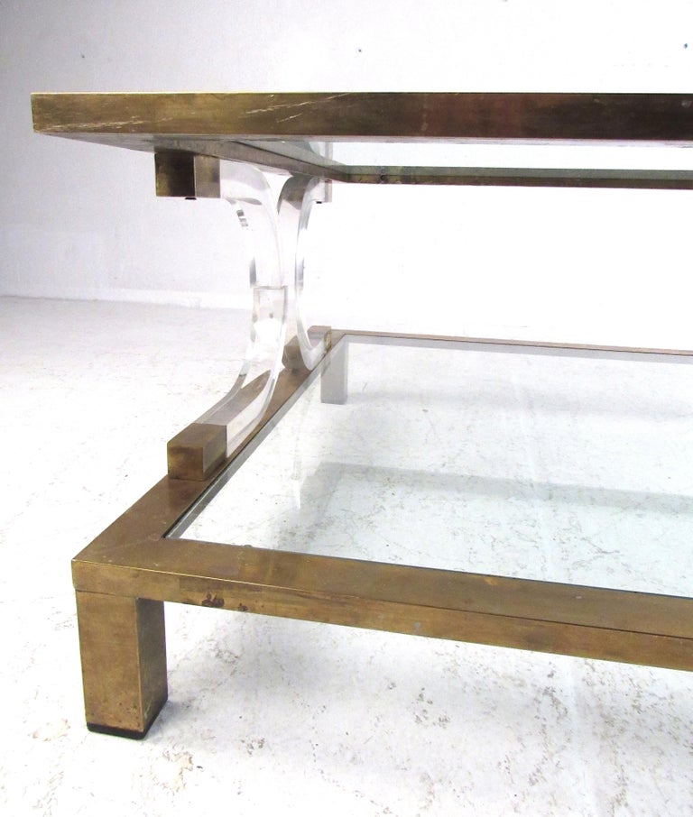 Unusual vintage coffee table with two tiers of glass tabletops, and a brass base. It adds visual quality to a room if it's placed. Sure to be a nice addition to any modern interior. Two tier round glass coffee table. Related articles to two tier glass coffee table